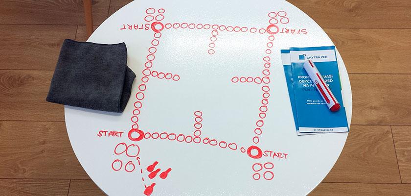 Takové "člověče, nezlob se!" na stole pokrytém popisovatelnou barvou má jedno úskalí: Kromě figurek soupeře vám cestu do domečku komplikují i zaschlé zbytky od oběda. Zdroj: chytrazed.cz