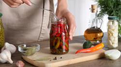 Obsah poté zalijte teplým nálevem z octa a vody. Skleničku uzavřete a nechte několik dní odležet na tmavém a chladném místě, aby pupeny získaly typickou chuť.