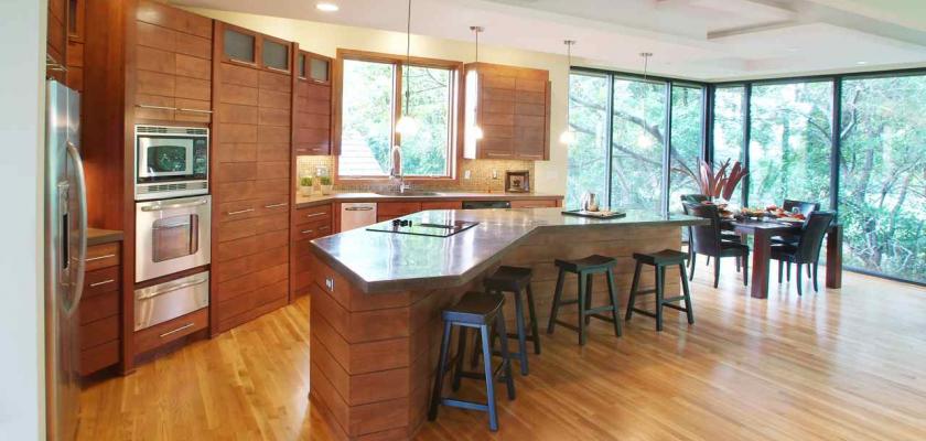 Dřevěné skříňky, dřevěná podlaha, stromy za oknem, v této kuchyni by se Tarzan cítil jako v doma v džungli. Zdroj: trandeco (trandecoration.com)